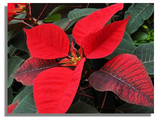 Poinsettia is very much in evidence around Christmas time, though in Scotland it has to be grown indoors as a house plant. Poinsettia is one of the large family of Euphorbia called "Pulcherrima". The flowers are actually the small yellow petals in the centre, the blood red colour being provided by bracts that look like brightly coloured leaves.