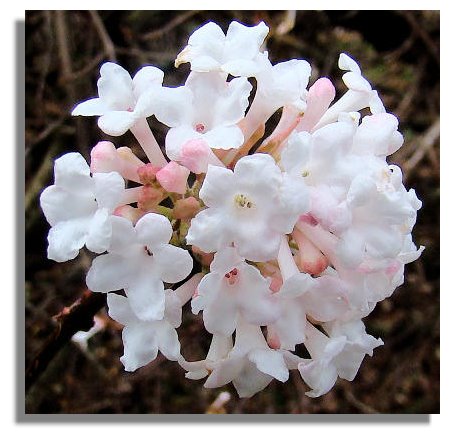 This variety of Viburnum starts to produce its delicate-looking flowers in the autumn and continues to bloom into the winter. Unlike the Poinsettia above, it grows outside, rather than under cover. It has a delicate perfume, too.