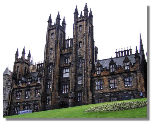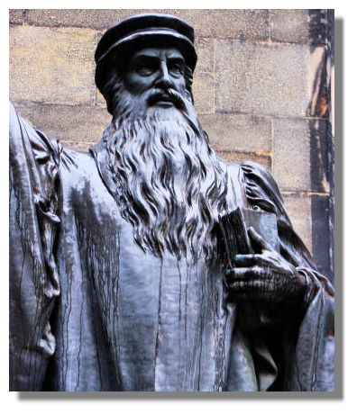 Within the courtyard of the Assembly Hall (above) stands an imposing statue of John Knox (1513-1572), arm upraised in a suitably declamatory pose. Knox was influenced by the Protestant ideas of Calvin in Switzerland. He came back to Scotland in 1559 and became minister at St Giles in Edinburgh. In 1560 the Scottish Parliament, with guidance from Knox, drew up the "Confession of Faith" which established Protestantism and government of the Church of Scotland along the lines he had learned in Geneva.