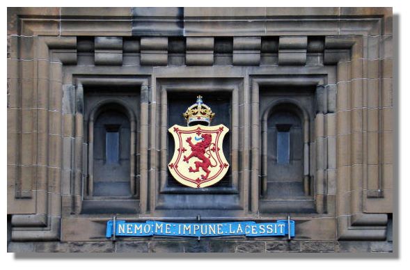 The lion rampant and the motto "Nemo Me Impune Lacessit" are displayed above the entrance to Edinburgh Castle. The Latin can be translated roughly as "Nobody provokes me unpunished" but is often rendered in Scots as "Wha daur meddle wi me." The motto is used on the Royal coat of arms in Scotland. It is also the motto of the Order of the Thistle, the Scottish chivalrous order and of the British Army regiments The Royal Regiment of Scotland and Scots Guards.