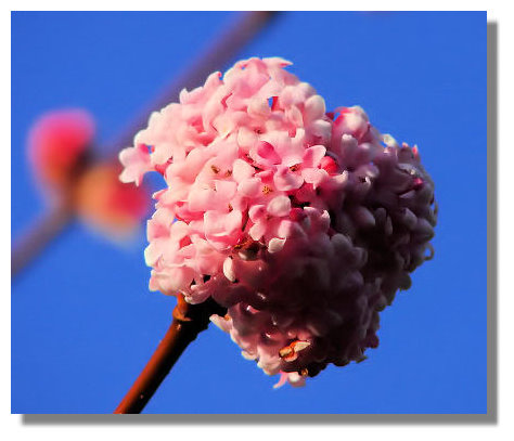Whenever you see a shrub with pink or white flowers in winter time in central Scotland, the chances are that it will be one of the many varieties of Viburnum. The flowers of this one at Colzium Lennox Estate stand out against the blue sky.