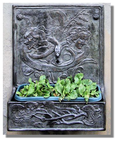 Often overlooked by the many tourists who visit Edinburgh Castle, this bronze fountain at the eastern end of the esplanade is near the site on which hundreds of "witches" were burned at the stake in the 16th century. The last witch was hanged in Scotland in 1728. The design of the memorial fountain incorporates a wicked head and a serene head to signify that while some used their knowledge for evil purposes, others were misunderstood. The serpent also has a dual significance of evil and wisdom, while the spray of Foxglove flowers further emphasises the dual purpose of many common objects. Since water no longer comes from the fountain, the trough has been filled (rather incongruously) with a plastic plant trough and primrose plants.