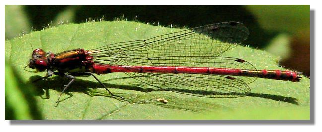 Pyrrhosma Nymphula is better known by its common name of "Large Red". It is one of only two red damselflies in Britain (the other one is the Red-eyed Damselfly). Damselflies are usually smaller than dragonflies and the Large Red grows to just 3.6 centimetres (just under 1½ inches) long. Yes, the camera got quite close!