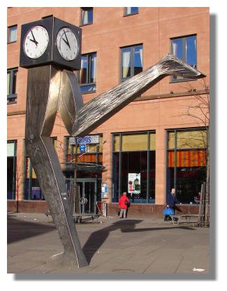 This modern sculpture of a clock with running legs is located very appropriately outside the Buchanan Bus Station, where the sight of passengers racing to catch a bus is not unknown!