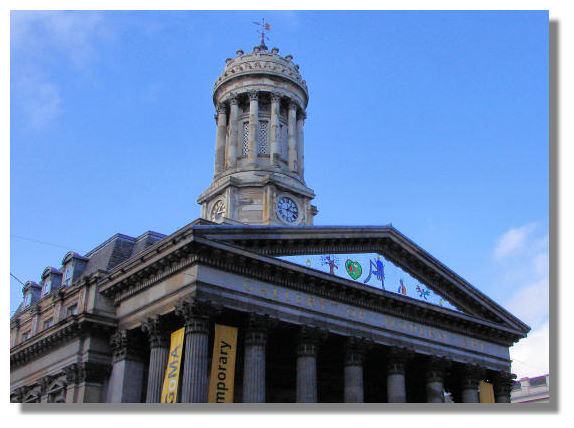 The Gallery of Modern Art (GOMA) is housed in the centre of Glasgow in a building originally built as an elegant, Grecian-style mansion for an 18th century tobacco merchant who had made his fortune in America. It later became the Stirling Library, but in the early 1990s it became the Gallery of Modern Art. As such, it has become a very popular with local Glaswegians as well as tourists. See also Places to Visit - GOMA.
