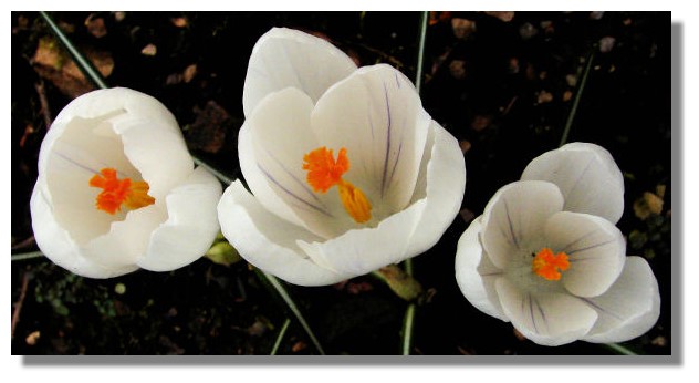 This variety of white crocus is a bit slower than the purple one above in coming into flower - and also needs that sun to encourage it to show off the contrasting orange stamens.