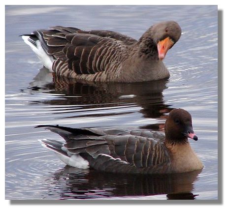 The solitary Pink-footed goose had obviously attracted the attention of this Greylag Goose, which was observed keeping close to the stranger - who looked a bit uncomfortable at the popularity. This photo is just asking to be entitled "Do you come here often" in the classic Glasgow dance-hall approach!