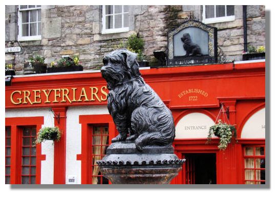 The statue of Greyfriars Bobby must be one of the most photographed in Edinburgh, a city which is full of sculptures (mainly dignitaries and famous sons of Scotland's capital). Bobby was immortalised in an American children's book by Eleanor Atkinson which portrays the Sky terrier's master as a farmer from the Pentland Hills. Bobby remained by his master's grave for 14 years after he was buried in the churchyard. He survived by being fed by locals who were impressed by his devotion. Recent research suggests the animal was owned by a local Edinburgh policeman - which is why he may have been called Bobby, one of the nicknames given to British policemen. The life-size statue of Bobby (who died on 14 January 1872) was erected on top of a drinking fountain outside Greyfriars Churchyard shortly after the dog's death.