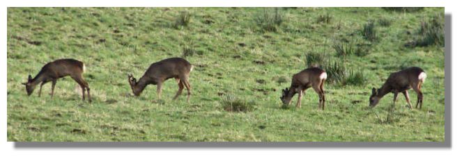 It is surprising that such a shy creature as the roe deer is often found near populated areas. They can be seen in the Necropolis (Glasgow's oldest cemetery, near the city centre) and in many parts of suburbia. At least these examples (a buck and three does) are out in the countryside, sharing the farmer's fields with the cows and horses. Shortly after this photograph was taken, they realised we were there - and bounded off.