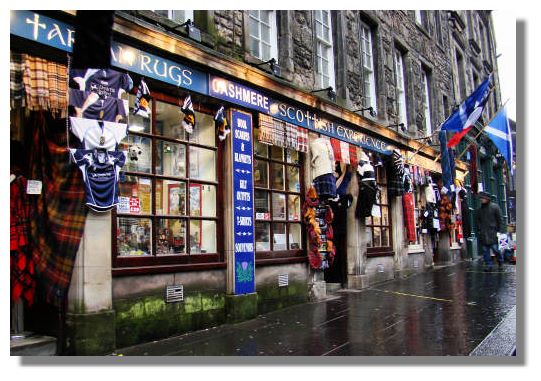 There are often complaints about the "Tartan tat" souvenir shops that have proliferated along the Royal Mile, selling low-priced souvenirs to passing tourists. "The Scottish Experience" is just one of many along this historic street selling tartan "kilts" (actually tea towels) for £10... Round the corner is "Thistle Do Nicely".
