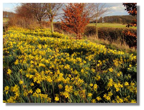 Most of the daffodils on this page were growing along the Fife Coastal Path between Dalgety Bay and Aberdour, with views across the Firth of Forth to Edinburgh in the distance.