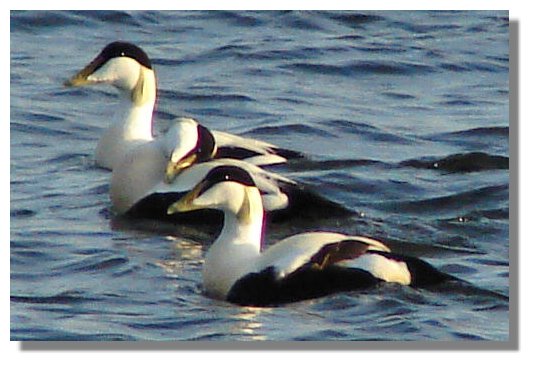 If the Eider Duck in the middle had not decided to preen himself just as I pressed the shutter, this would have been a perfect line-abreast formation. I suppose I should be grateful that they stayed on the surface - it's not unusual to take a photo and find that they have dived under the water and all that's on the graphic is a patch of water... The joys of nature photography! This trio were part of a large group feeding in the Firth of Clyde, off Helensburgh. The lime green on the side of the male's head is most distinctive amongst UK birds.