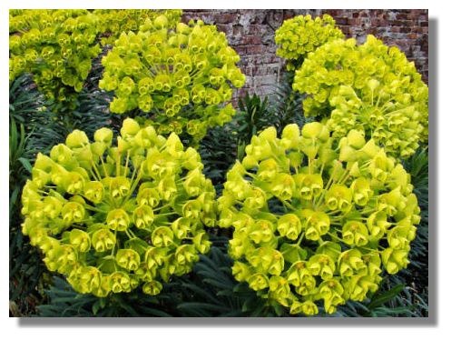 There are nearly 2,000 different varieties of Euphorbia, ranging from tiny annuals to large trees. The "flowers" are actually bracts called "cyathium". This variety is a bush growing in a long flower bed below Culzean Castle. Most of the other plants are grown for their colours in summer or autumn, so this early variety, covered in its bright pom-pom like flowers (each larger than a fist) stood out like a beacon.