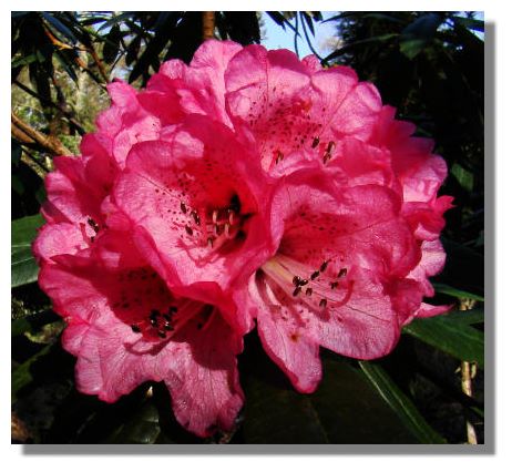 Modern plant breeders can produce Rhododendrons in every flower colour except true blue and they also blend two or more colours to create flares in the throats of the trumpets. This one is also has particularly large blooms.