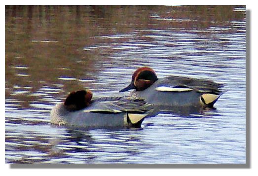 Teals are slightly smaller than Mallards and although some breed in Britain, most of the nearly 200,000 found in winter in the UK have come from Iceland and northern Europe, reaching these shores in October and November, leaving again in March. The bird on the left decided to do a bit of preening, just as the camera shutter opened...