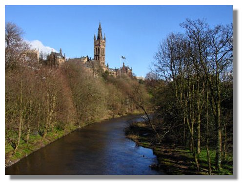 Here is a picture of the University of Glasgow, with the river Kelvin below. The university was founded in 1451 but moved to this site in 1870. The magnificent main building was designed in the Gothic style by Sir George Gilbert Scott. With its prominent position on the top of a Gilmorehill, it is visible from all over the city and beyond its boundaries.
