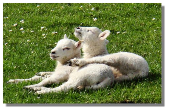There are quite a lot of spring lambs in the fields now. These two siblings seem to be enjoying the sunshine - but still keeping close to one another for warmth!