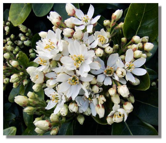 Choisya is largely grown for its brilliant greeny yellow leaves which it displays throughout the year. The leaves shine out like a beacon on a dull winter's day. It also has these attractive clusters of sweetly scented flowers - while the leaves are also highly aromatic when crushed. The shrub is a native to Mexico and South-West USA.