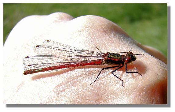 While attempting to take close-up photographs of Damselflies at the Royal Society for the Protection of Birds (RSPB) reserve at Lochwinnoch in Renfrewshire, this one was most obliging and flew onto the back of my hand, where it posed for a few minutes while I took its portrait!