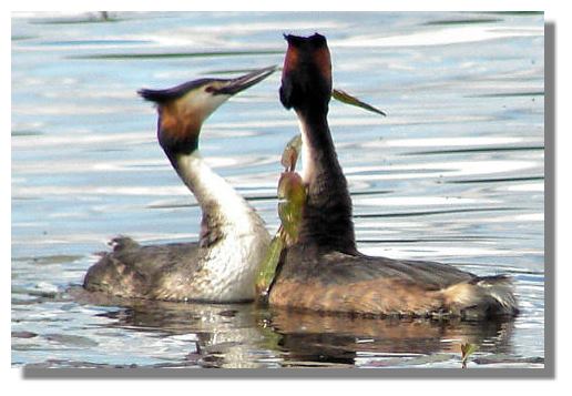 The Great Crested Grebe is famous for its courtship dance, in which the two birds make synchronised dives, face one another, with much head shaking. The male bird will also bring water weed or fish and present it to his mate. The birds here look like youngish birds (the crest is not yet fully developed) but are nevertheless going through the rituals.
