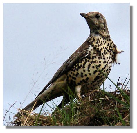 The Mistle Thrush is larger than the more frequently seen Song Thrush and its speckles are made up of bigger spots. It is also much shyer than the Song Thrush and is rarely seen in suburban gardens. This one was photographed in the countryside north of Glasgow.