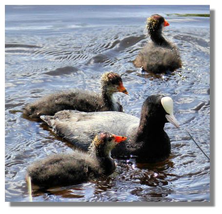 Unlike the Mallards, both Coot parents not only look after their offspring, they work hard at feeding their hungry chicks. When they initially hatch, the female stays with them in the nest for the first few days and the male brings them food. Coots are often very territorial and violent fights can break out if a rival bird strays too close.