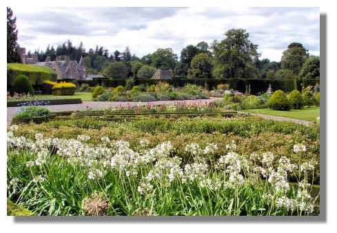 The Italian Garden at Glamis Castle has an air of serenity with lots of pastel colours and formal fan-shaped parterres, surrounded by yew hedges. The entrance gates commemorate the 80th birthday of the late Queen Mother - when they were put up, nobody knew that she live to be over 100.