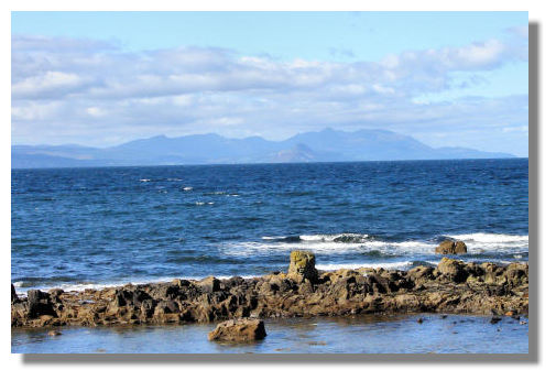 Arran (seen in the distance from the Ayrshire coast at Maidens) is the largest island in the Firth of Clyde and is often described as "Scotland in miniature". It has a mountainous north (Goat Fell is over 2,800 feet high), the geological Highland fault line (which marks the edge of the Highlands on the mainland) runs through it, and there are hills in the south, which mirror the Southern Uplands. Brodick, the largest town on the island, has a resident population of just over 800.