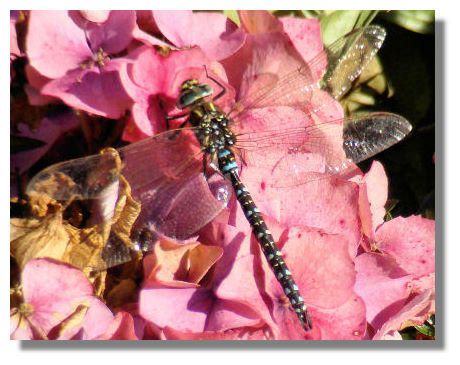 We don't often have insects three inches long with flashing wings flying at us in Scotland - but the Common Hawker Dragonfly is exceptional. They usually dart around quickly, feeding on midges and flies, so it has been difficult to get a photograph. But this one decided to rest on a Hydrangea flower in the garden in front of Culzean Castle in Ayrshire.
