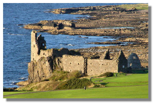 Dunure Castle is the ancient seat of the Kennedys of Carrick, later the Earls of Cassilis. The original 13th century tower was later extended and altered. In the middle of the 17th century the castle appears to have been set on fire and blown up and by the end of the century it had been abandoned. The dovecote (on the right) is the best preserved part of the site.
