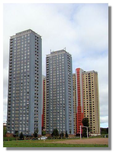 In the 1950s and 1960s there was an explosion of building of high apartment blocks around Glasgow, as the city council attempted to do something about the slums and bomb-damaged inner-city areas. Of course, the "filing cabinets for people" created their own problems. Now, the housing authority is planning to demolish many of them - including these ones at Red Road, Balornock. In recent years they have been given a lick of exterior paint to try to brighten them up.
